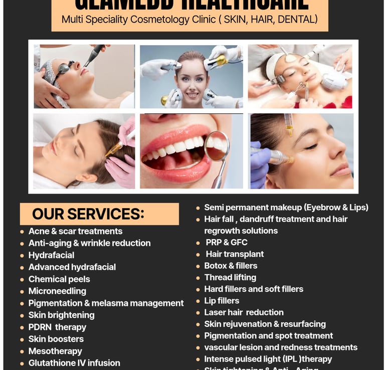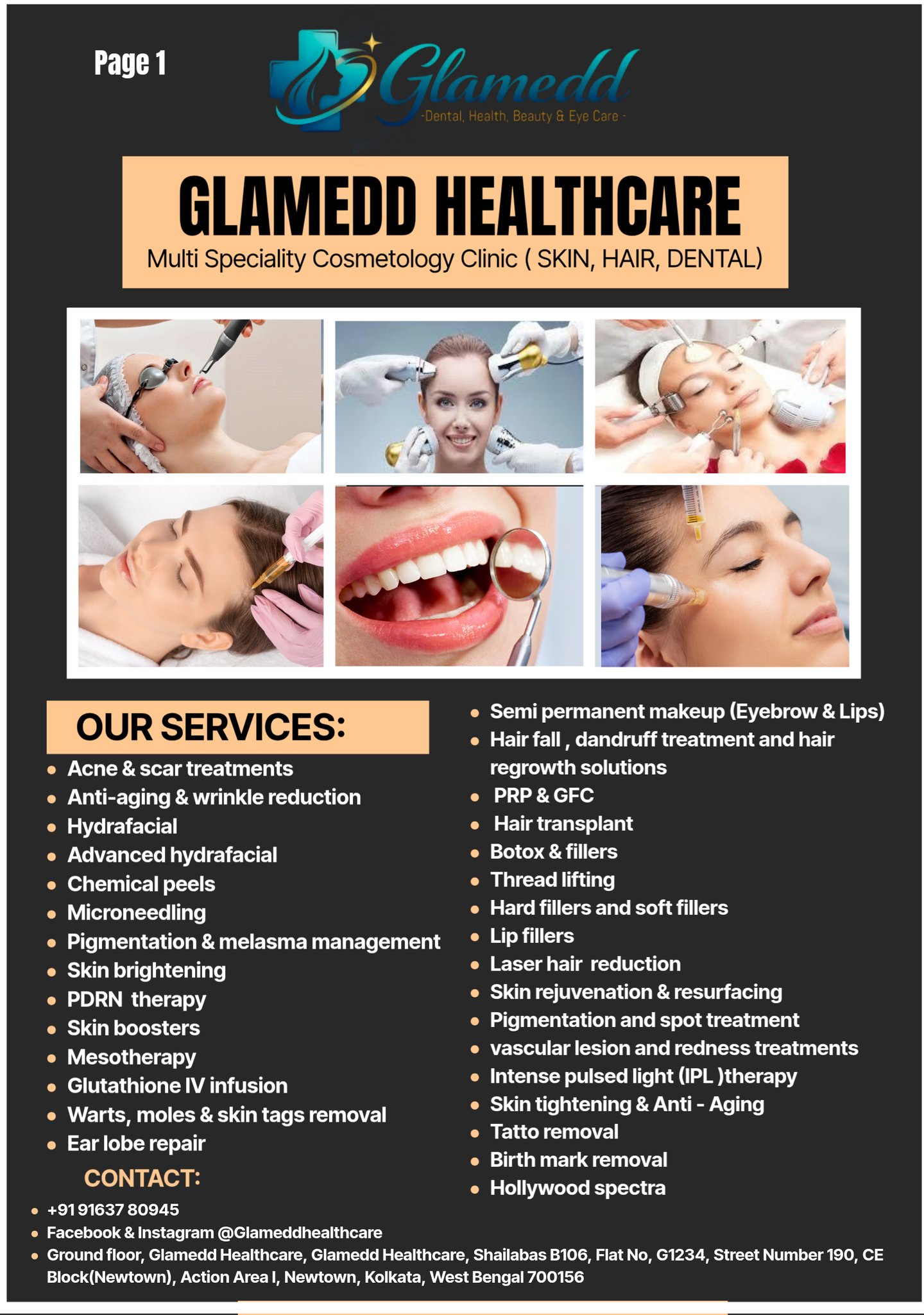 Glamedd Clinic is a premier destination for advanced dental, cosmetology, and health care. Located in the heart of Newtown, our state-of-the-art clinic offers a comprehensive range of services, where health seamlessly meets beauty. Owner's : Dr. Amalita Mandal & Pijush Sarkar, Glamedd provide expert care to enhance your natural glamour and well-being. From stunning dental aesthetics to transformative cosmetic treatments, we are dedicated to helping you look and feel your absolute best. Serving the West Bengal community, Glamedd Clinic is the perfect blend of medical expertise and aesthetic artistry