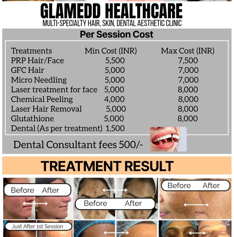 Acne & scar treatments, Anti-aging & wrinkle reduction, Hydrafacial, Advanced hydrafacial, Chemical peels, Microneedling, Pigmentation & melasma management, Skin brightening, PDRN therapy, Skin boosters, Mesotherapy, Glutathione IV infusion, Warts, moles & skin tags removal, Ear lobe repair, Semi permanent makeup (Eyebrow & Lips), Hair fall, dandruff treatment and hair regrowth solutions, PRP & GFC, Hair transplant, Botox & fillers, Thread lifting, Hard fillers and soft fillers, Lip fillers, Laser hair reduction, Skin rejuvenation & resurfacing, Pigmentation and spot treatment, vascular lesion and redness treatments, Intense pulsed light (IPL )therapy, Skin tightening & Anti - Aging, Tatto removal, Birth mark removal, Hollywood spectra.