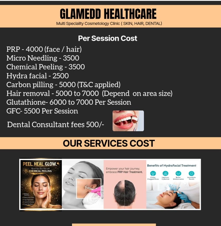 Acne & scar treatments, Anti-aging & wrinkle reduction, Hydrafacial, Advanced hydrafacial, Chemical peels, Microneedling, Pigmentation & melasma management, Skin brightening, PDRN therapy, Skin boosters, Mesotherapy, Glutathione IV infusion, Warts, moles & skin tags removal, Ear lobe repair, Semi permanent makeup (Eyebrow & Lips), Hair fall, dandruff treatment and hair regrowth solutions, PRP & GFC, Hair transplant, Botox & fillers, Thread lifting, Hard fillers and soft fillers, Lip fillers, Laser hair reduction, Skin rejuvenation & resurfacing, Pigmentation and spot treatment, vascular lesion and redness treatments, Intense pulsed light (IPL )therapy, Skin tightening & Anti - Aging, Tatto removal, Birth mark removal, Hollywood spectra.